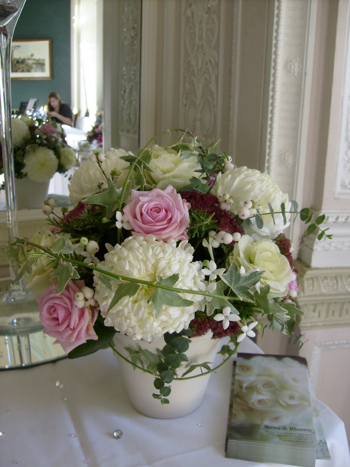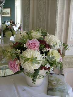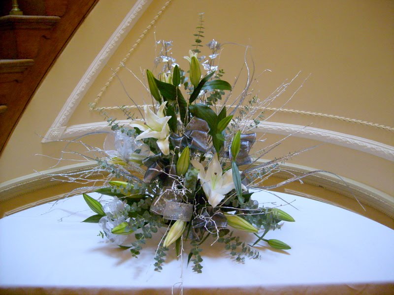 The fireplace was decorated with an arrangement incorporating the ribbons and artificial silver flowers provided by Sarah along with 'Akito' roses, Oriental lilies, Singapore orchids and trailing ivy.