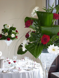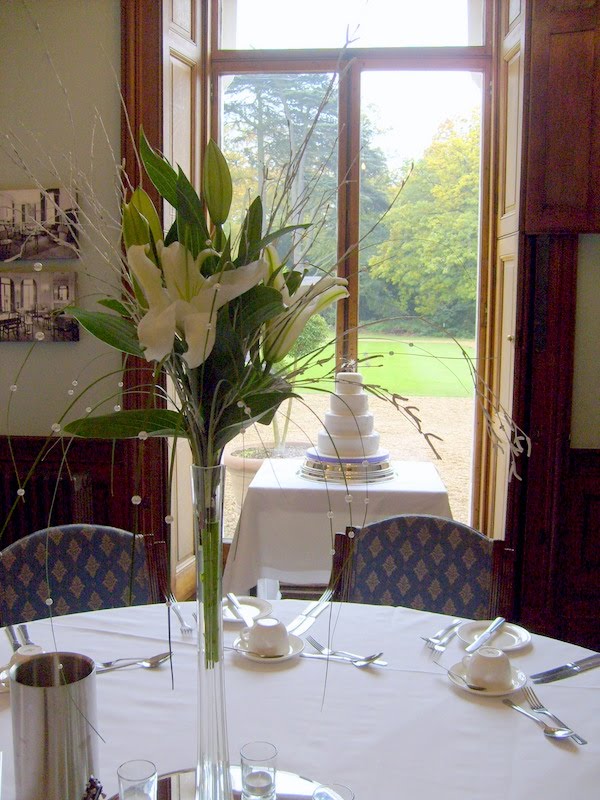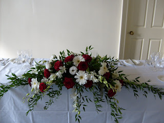 For the head table/ceremony room I incorporated the ribbons and crystal twigs that Sarah had supplied along with white oriental lilies, 'Akito' roses and Singapore Orchids.