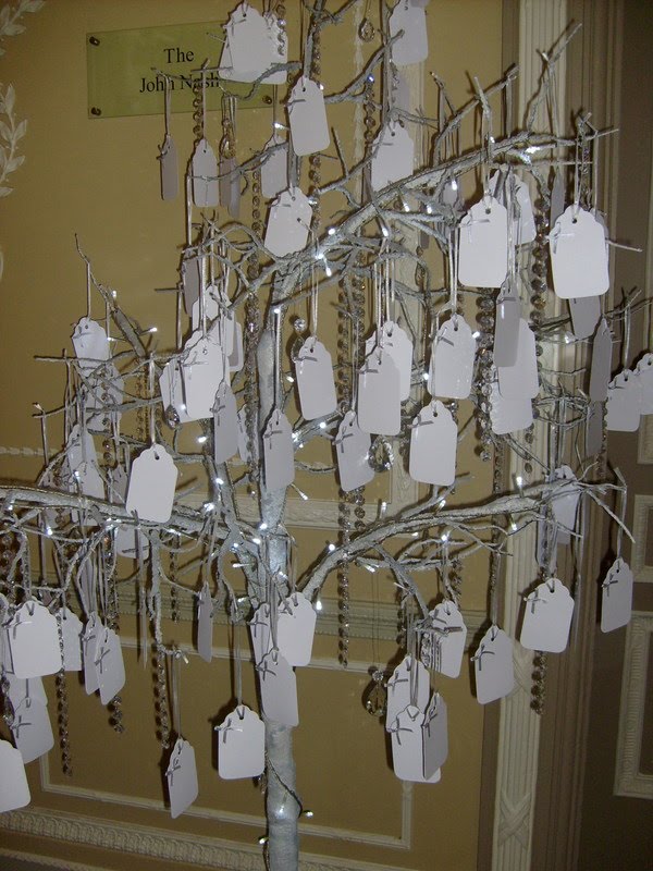 I also provided a Wishing Tree for guests to write messages to the Bride and Groom. This was decorated with white tags with silver ribbon to tie in with the colour scheme. The staircase was simply dressed with white organza and finished off with large bows at the bottom.