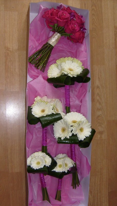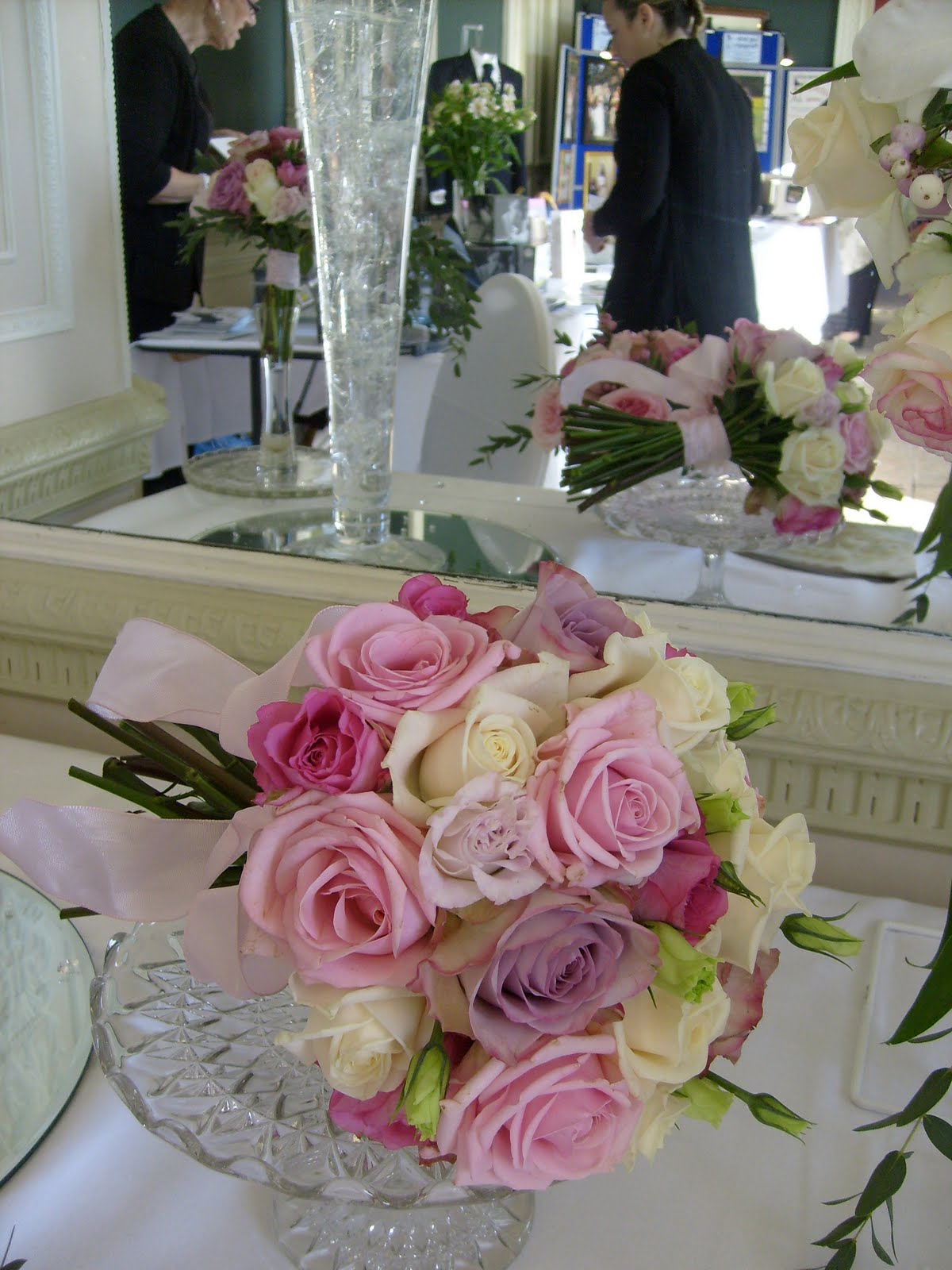 Sarah chose a hand tied bouquet of ivory 'Akito' roses, lilac 'Pacific Blue' roses, rosemary, berried ivy and verigated ivy. It really looked amazing and the photos below don't do it justice. The bridesmaid bouquets were of ivory 'Akito' roses bound with silver ribbon.