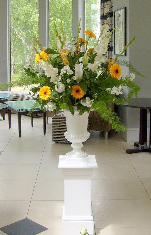 In the urns I used the same 'Cachet' gerbera along with ivory and gold gladioli, ivory stocks, ivory Oriental lilies and september along with foxtail foliage.