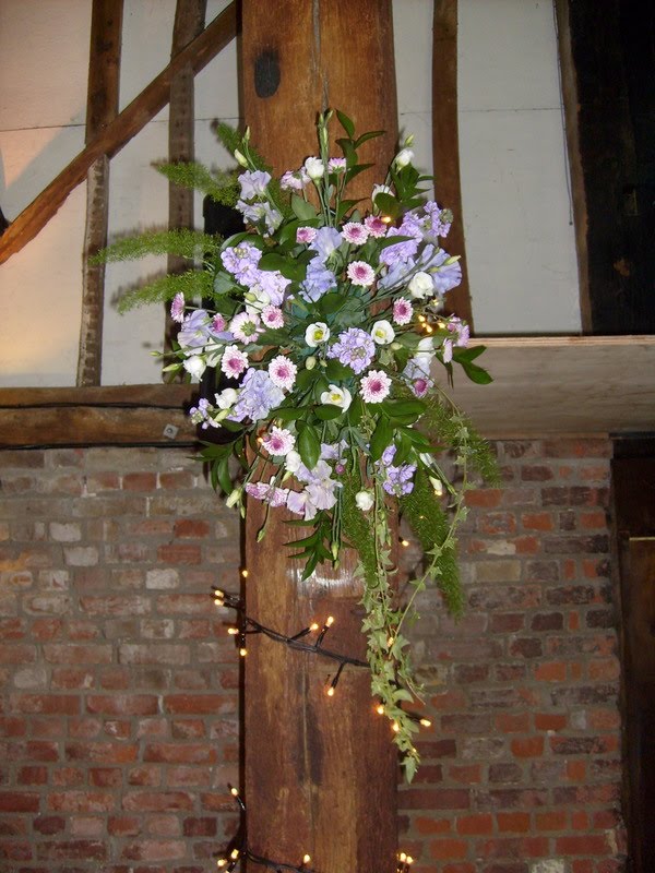 Spring is always a lovely time for weddings and in April this year saw the wedding of Jo and Steve at Cooling Castle Barns. This was one of my favourite weddings, the colour scheme was lilac and ivory - just perfect for spring. Jo and Steve wanted an abundance of flowers and decided on large table arrangements over a metre in height! They also wanted flower arrangements hanging on each of the pillars in the main reception room.