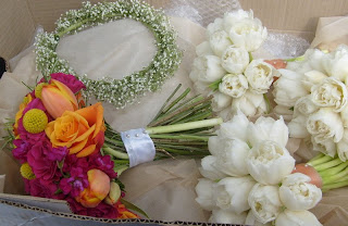 I forgot to photograph the bouquets but these were simple too, cream Akito rose hand tied bouquets for the bridesmaids and the same for the Bride only with loops of bear grass inbetween the roses. The two flower girls carried a single Akito rose with cherry ruscus foliage and cream ribbons. Buttonholes were simple - Akito roses with cherry ruscus foliage.