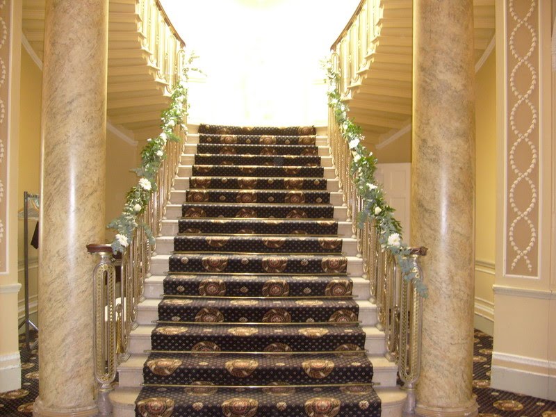 The staircase was decorated with eucalyptus and cherry ruscus foliage and dotted with gerbera and Akito roses.