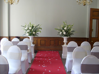 In the ceremony room, two urn arrangements were placed at the end of the aisle and the chairs decorated with white chair covers with alternate bows in champagne and chocolate brown organza.