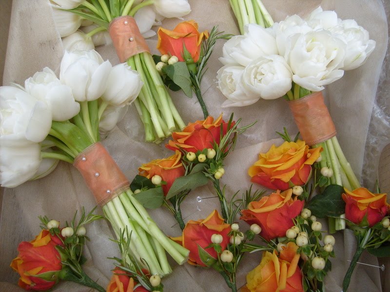 For the bridal bouquet I used Cherry Brandy roses, coral Ad Rem tulips, hot pink spray roses, hot pink stocks, yellow craspedia and rosemary. The overall effect was really striking.