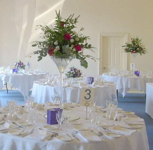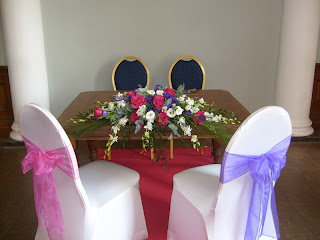 I was back at Sundridge Park Manor again on Saturday for another wedding. The bride chose a hot pink and purple colour scheme which is a great combination. The bride carried a trailing bouquet of Power roses, white double lisanthus, purple lisianthus and white Singapore orchids. The bridesmaids carried hand tied bouquets of Purple Power roses, white double lisianthus and purple lisianthus (no photos).