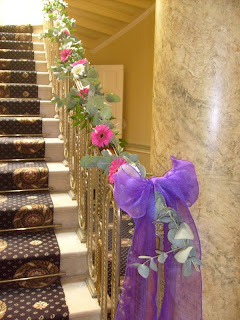 The staircase was dressed with eucalyptus and cherry ruscus foliage with cerise and ivory germini and finished off with a purple organza bow.