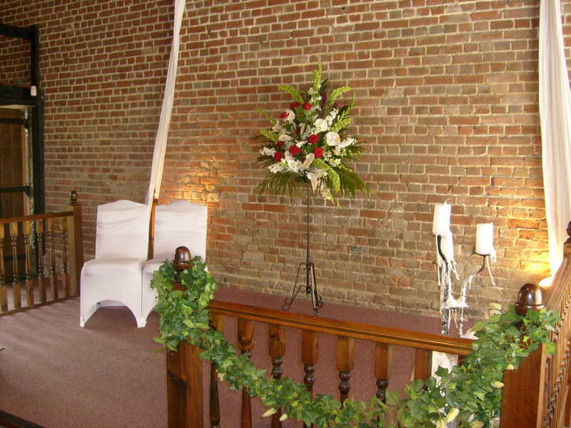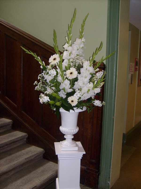 At the bottom of the stairs I placed a white urn and plinth with an arrangement of gladioli, stocks, lilies, gerberas and chrysanthemums.