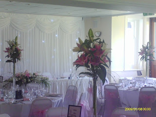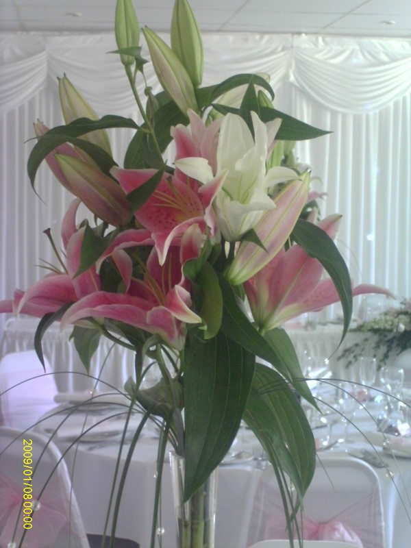 At the venue I created martini vase arrangements using gerbera, lilies, stocks and chrysanthemums.