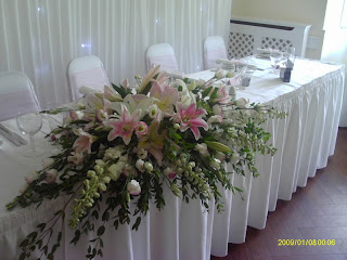 A traditional long low head table arrangement was created using lilies, gerberas, stocks and foliage.