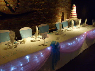 I provided chair covers for the wedding with both turquoise and pale pink organza sashes. The head table was dressed with pale pink organza swags with turquoise bows and finished with fairy lights.