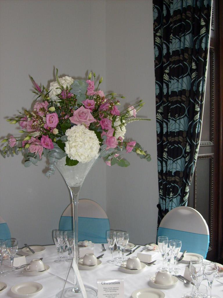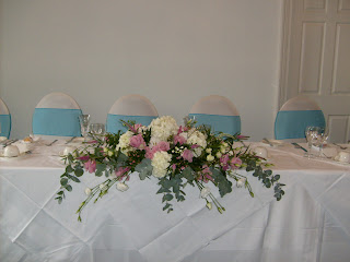 On Saturday I provided flowers and chair covers for Louisa and Paul's wedding at Sundridge Park. When Louisa and Paul first came to see me, Louisa had no idea about what flowers she wanted. We looked through magazines and photographs before deciding upon pink Keano roses, lisianthus, veronica, bouvardia, hydrangeas and waxflower. The bridesmaids' dresses were turquoise so we tied this in with the chair sashes and the pink flowers worked beautifully with the blue.