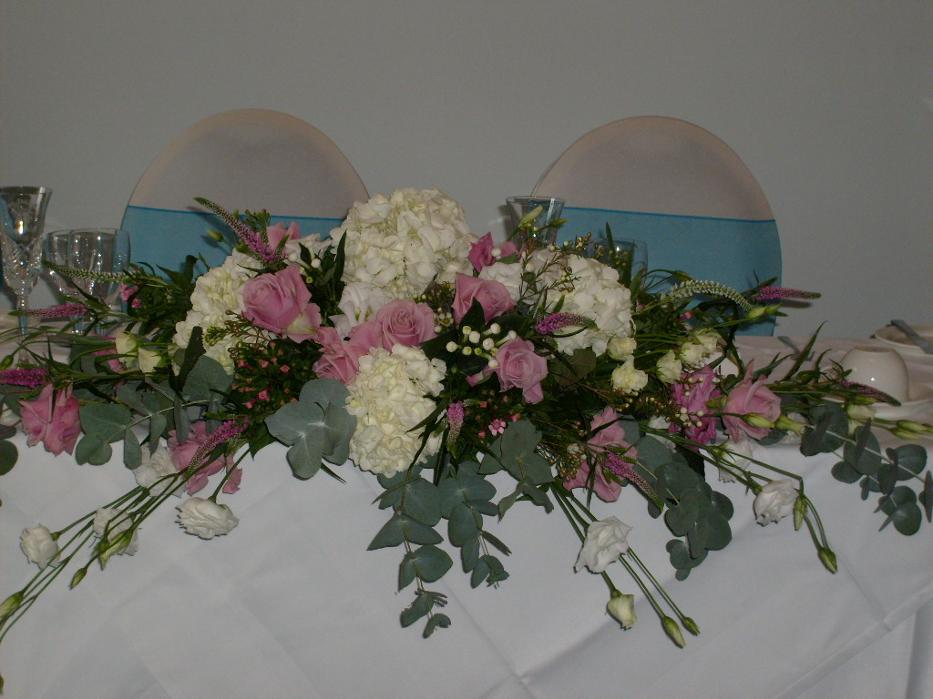 For the table arrangements, Louisa chose large martini vase arrangements of white hydrangea, pink Keano roses, pink double lisianthus, pink and white veronica and pink and white waxflower. The head table consisted of the same flowers along with white and pink bouvardia.
