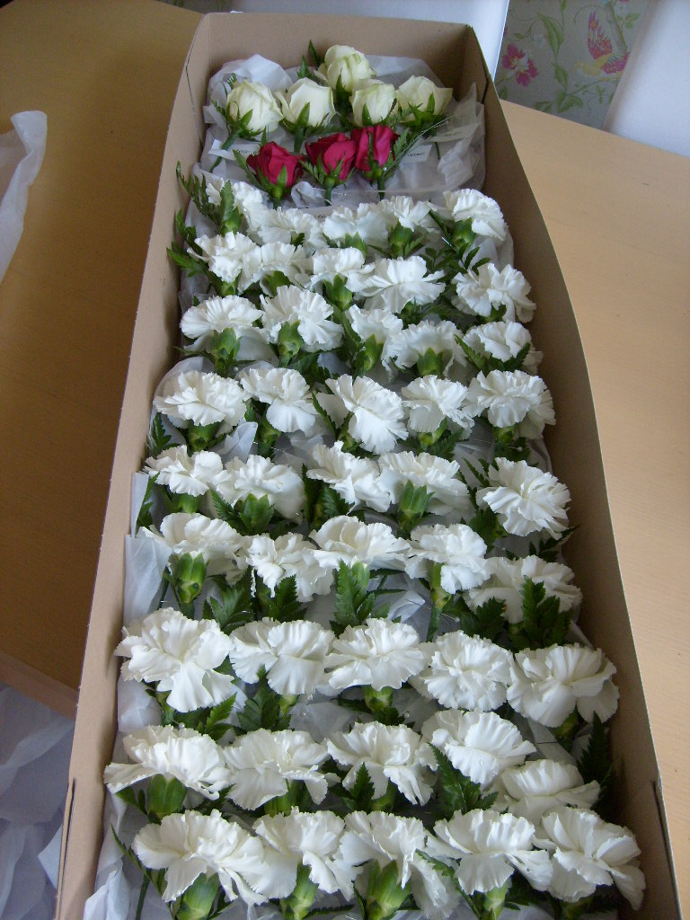 All the guests were given carnation buttonholes and for the wedding party buttonholes I provided Avalanche roses for the men and Purple Power for the ladies.