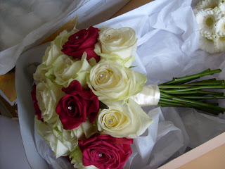 On Saturday I provided flowers and chair covers at Broke Hill Golf Club.  For Rebekah's bouquet I used ivory 'Avalanche' roses and a scattering of cerise 'Purple Power' roses which have the most amazing scent. The bridesmaids carried ivory 'Albino' germini bouquets bound with cerise ribbon.