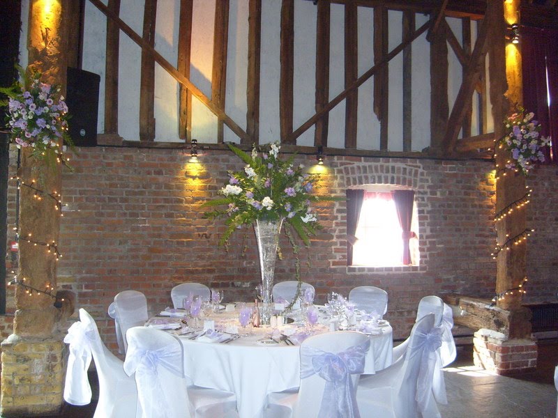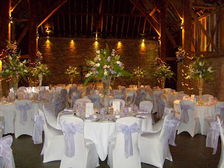 Spring is always a lovely time for weddings and in April this year saw the wedding of Jo and Steve at Cooling Castle Barns. This was one of my favourite weddings, the colour scheme was lilac and ivory - just perfect for spring. Jo and Steve wanted an abundance of flowers and decided on large table arrangements over a metre in height! They also wanted flower arrangements hanging on each of the pillars in the main reception room.