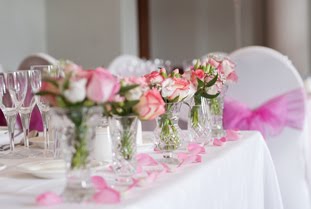 Tracy's table arrangements for the guest tables were very contemporary. Martini vases were filled with pink crystals and water with rose petals floating on top.