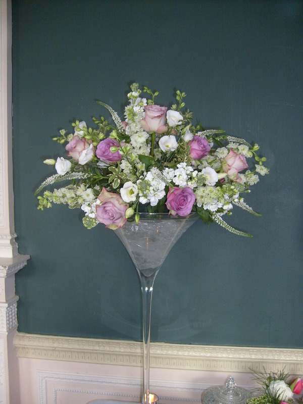 Martini Vase arrangement of white stocks, white larkspur, white lisianthus, white veronica, lilac Memory Lane roses, pink Cool Water roses and mini pittosporum foliage.