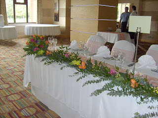 The head table was dressed with a garland of eucalyptus and cherry ruscus and adorned with pink ranunculus, coral tulips, hypericum berries and yellow snapdragon with an arrangement at either end.