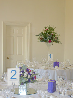 I was back at Sundridge Park Manor again on Saturday for another wedding. The bride chose a hot pink and purple colour scheme which is a great combination. The bride carried a trailing bouquet of Power roses, white double lisanthus, purple lisianthus and white Singapore orchids. The bridesmaids carried hand tied bouquets of Purple Power roses, white double lisianthus and purple lisianthus (no photos).