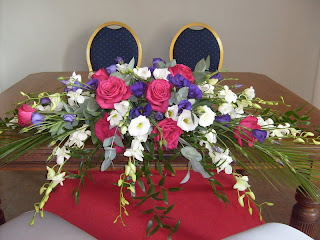 The head/ceremony table arrangement consisted of Purple Power roses, white and purple lisianthus, white Singapore orchids and foliage. I provided chair covers with hot pink and ultra purple sashes.