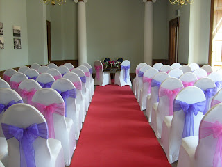 The staircase was dressed with eucalyptus and cherry ruscus foliage with cerise and ivory germini and finished off with a purple organza bow.