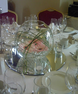 For the tables Lisa went for pale 'Pink Eye' gerbera in goldfish bowls with bear grass. These were placed on a mirror plate with tea lights around.