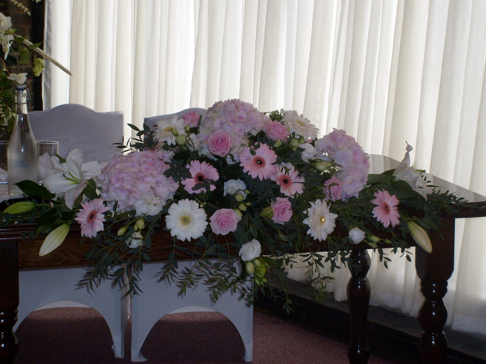A combination of pale pink hydrangeas, ivory gerbera, pale pink gerbera, white Oriental lilies, asparagus meyer and hard ruscus were used to create the large full arrangements. These were placed on a 80cm fluted vase and placed on a mirror plate with tea lights.