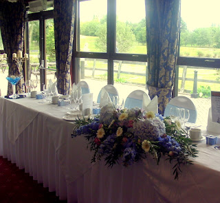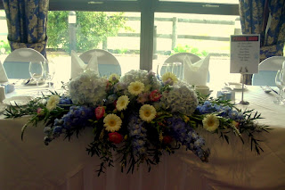 The head table was dressed with a long low arrangement of blue delphinium, blue hydrangeas, white veronica, white and pink lisianthus, lilac freesia and ivory germini.