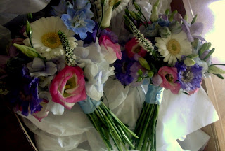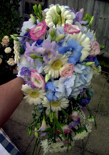 On Sunday I provided flowers for Hannah and Steve's wedding at the Weald of Kent Golf Club in Headcorn. Hannah's vision for the day was for country style flowers to complement her bridesmaid's baby blue dresses. We decided on a selection of beautiful, bright and colourful flowers including ivory germini, pale blue delphinium, baby blue hydrangea, lilac freesia, white and pink lisianthus, white veronica and lilac sacbiosa.