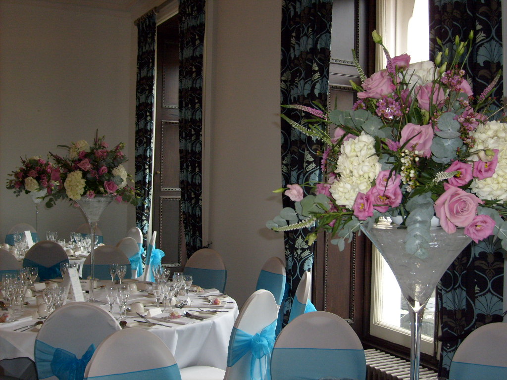 On Saturday I provided flowers and chair covers for Louisa and Paul's wedding at Sundridge Park. When Louisa and Paul first came to see me, Louisa had no idea about what flowers she wanted. We looked through magazines and photographs before deciding upon pink Keano roses, lisianthus, veronica, bouvardia, hydrangeas and waxflower. The bridesmaids' dresses were turquoise so we tied this in with the chair sashes and the pink flowers worked beautifully with the blue.