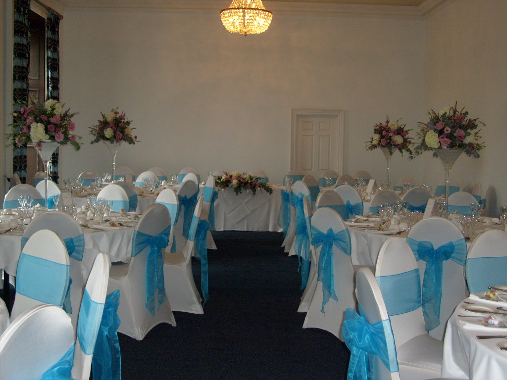 White chair covers and a turquoise organza sash completed the look. The newly decorated Prince Regent room tied in nicely with the colour scheme.