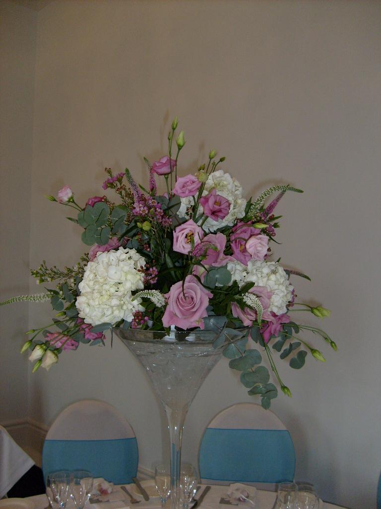 For the table arrangements, Louisa chose large martini vase arrangements of white hydrangea, pink Keano roses, pink double lisianthus, pink and white veronica and pink and white waxflower. The head table consisted of the same flowers along with white and pink bouvardia.